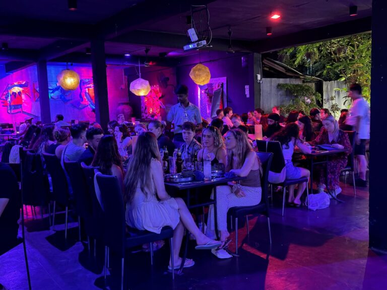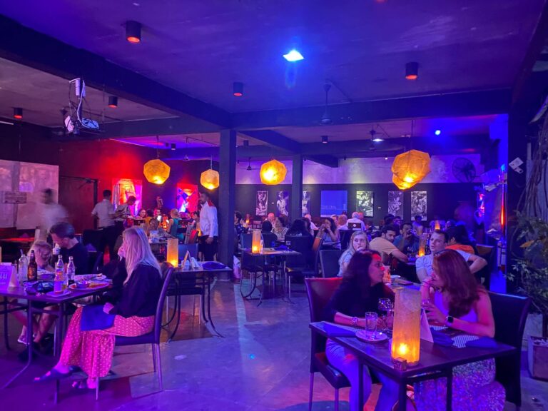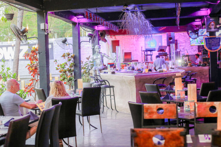 A stylish lounge dining outlet with a covered open terrace cooled by fans.
